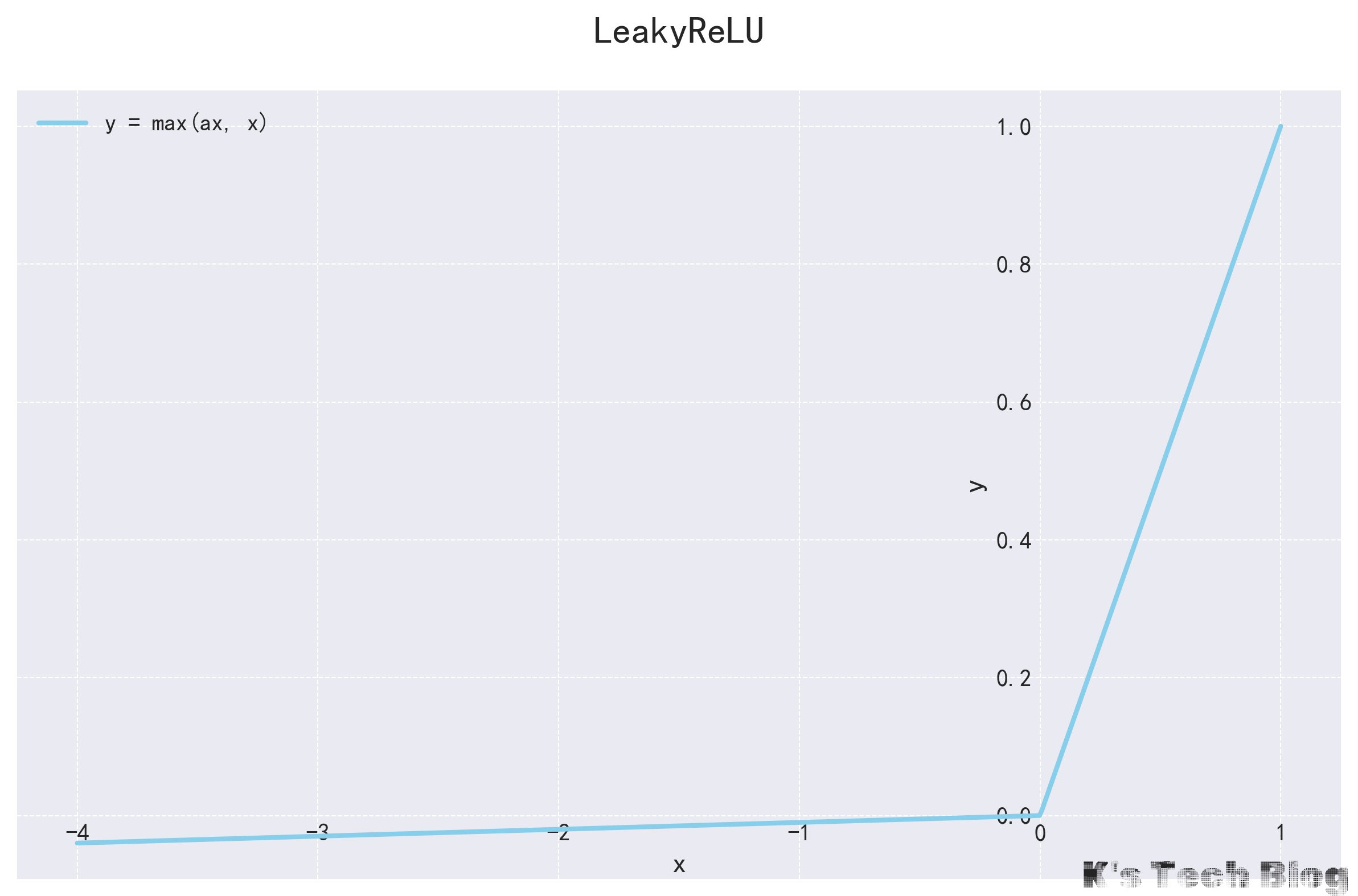 $$ f(x) = max(ax, x) $$LeakyRelu,全称为“带泄露的修正线性单元”,是经典激活函数ReLU(Rectified Linear Unit)的一个改进版本。- 核心思想是:输入值为负的时候,不再像ReLU那样直接输出0,而是输出一个非常小的、非零的、固定的整数。