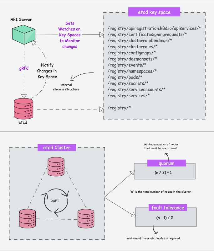 - 在生产环境中,etcd 集群通常由 3、5 或 7 个节点组成,确保高可用性和容错能力。