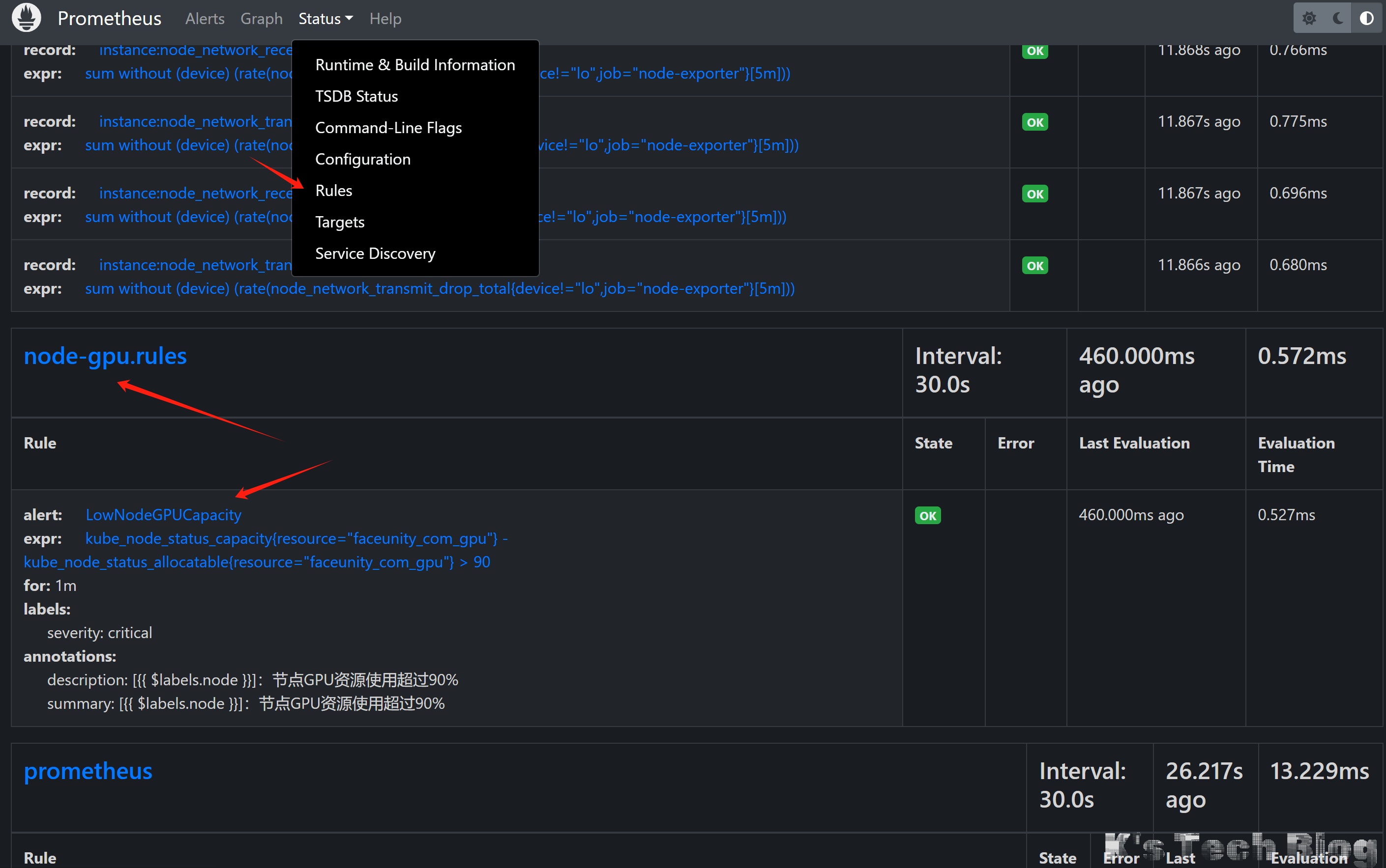 description: "[{{ $labels.node }}]:节点GPU资源使用超过90%"执行kubectl apply -f node-gpu-rules.yaml之后,就可以在kubectl get PrometheusRule -n monitoring中看到了,并且去到Prometheus dashboard,在rules中也能看到了: