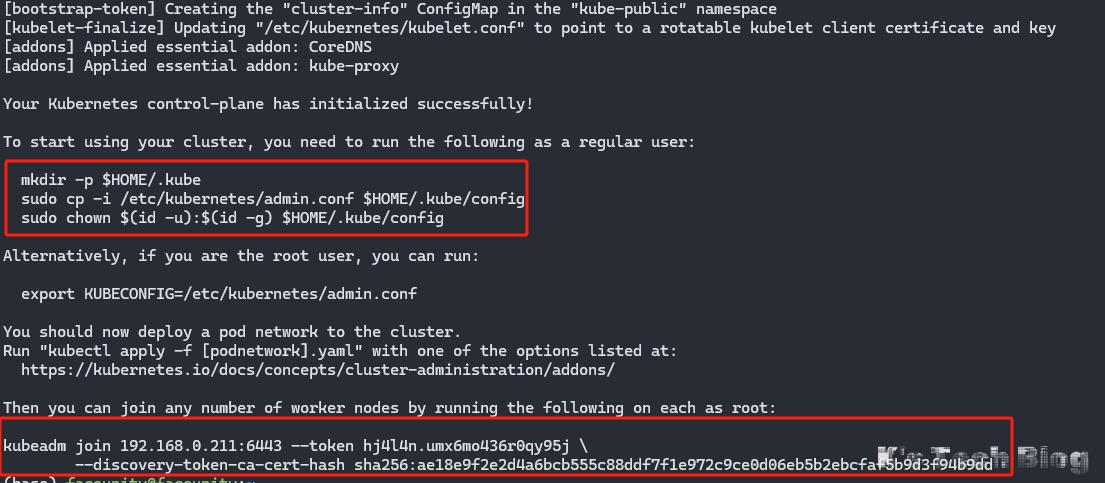 sudo kubeadm init --control-plane-endpoint=$IPADDR --apiserver-cert-extra-sans=$IPADDR --pod-network-cidr=$POD_CIDR --node-name $NODENAME # --cri-socket=/var/run/crio/crio.sock crio不支持nvidia-containerd 所以还是要用containerd搞定之后,会打印一些配置信息和worker node加入的指令,这些需要记录一下: