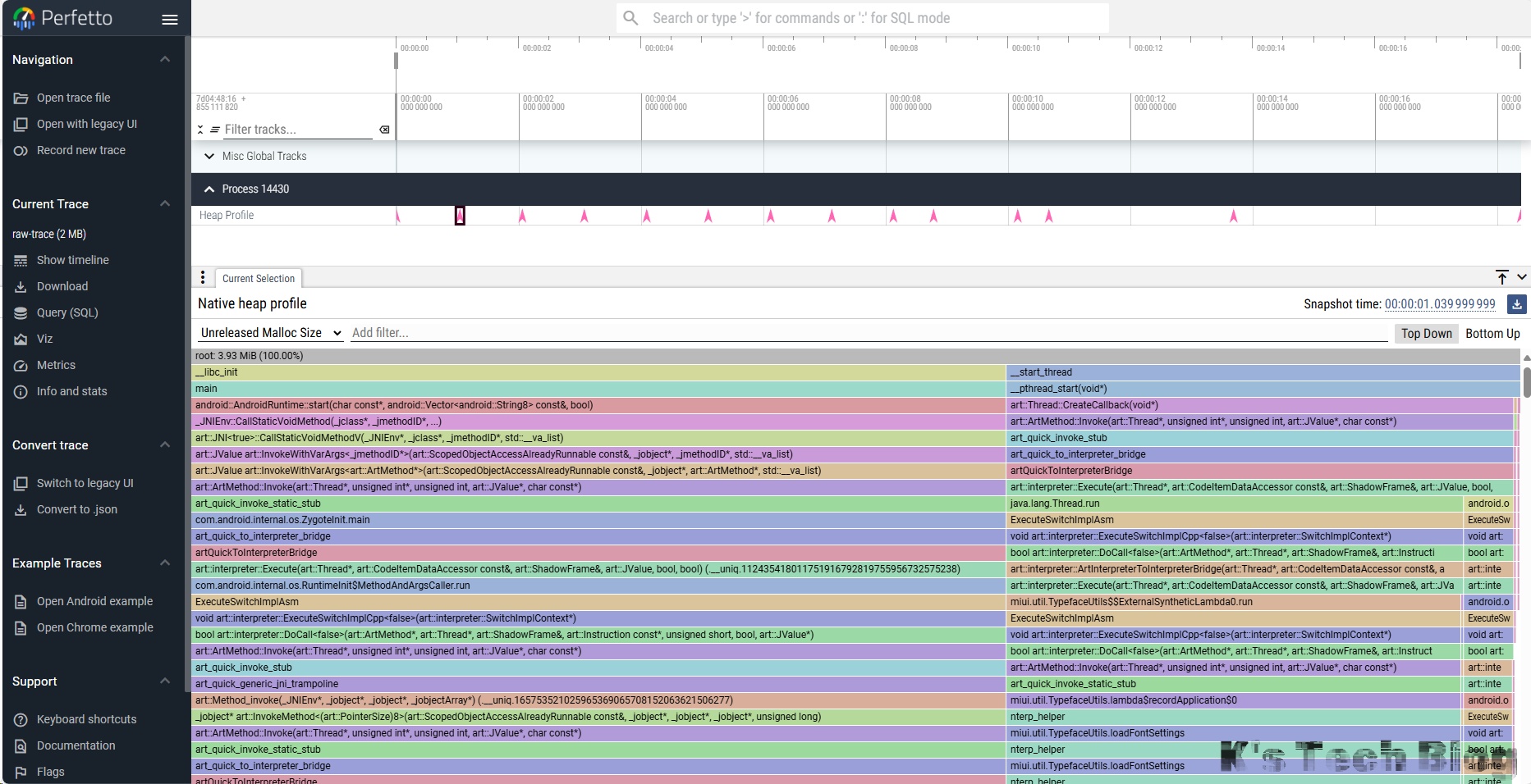 Example version: 5d5a16bf00db9788d85231e44dfbde2650164d2c fuai commit id: 287037a2d788551fa018aafb3a4f8e07a18eb297 CNamaSDK commit id: 1a65170344aa5ed075e2c409a56fd4a0b4cb92bd 测试项目: kaihang/AndroidMemoryProfiler ,点击Run SDK运行四次,每个5s抓一次内存信息,分析运行结束之后的内存(释放之后的内存是否有增长)。 抓取的trace信息:symbolized-trace,可以使用 https://ui.perfetto.dev/ 可视化,filter的使用方式参考测试。