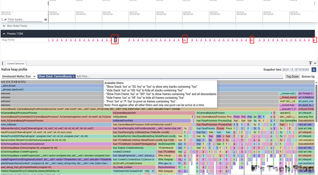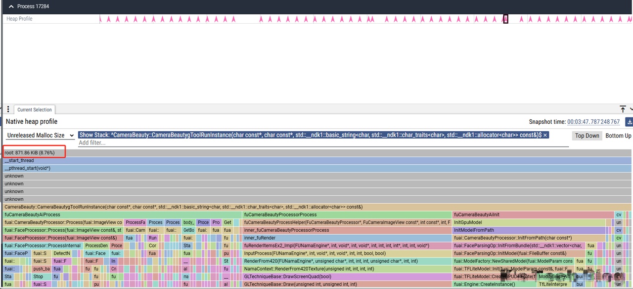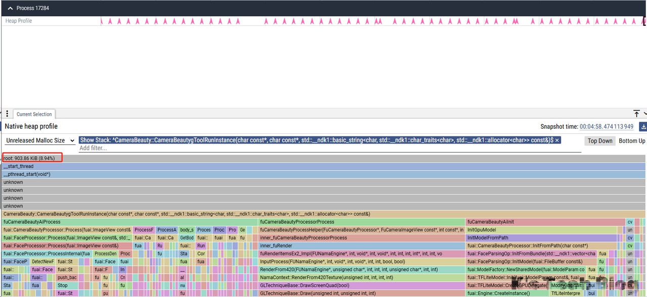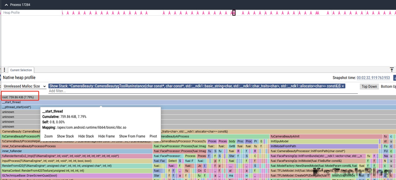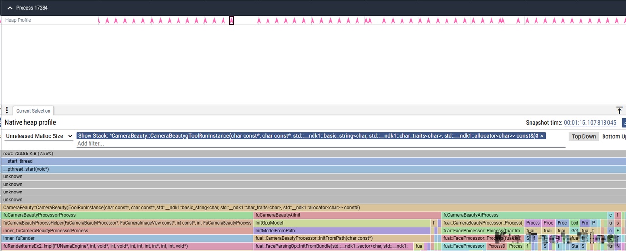 随后隐藏Profile和cv部分,再次检查,和上述fuCameraBeautyCreateProcessorInstance部分的波动对的上,也即没有内存增长。